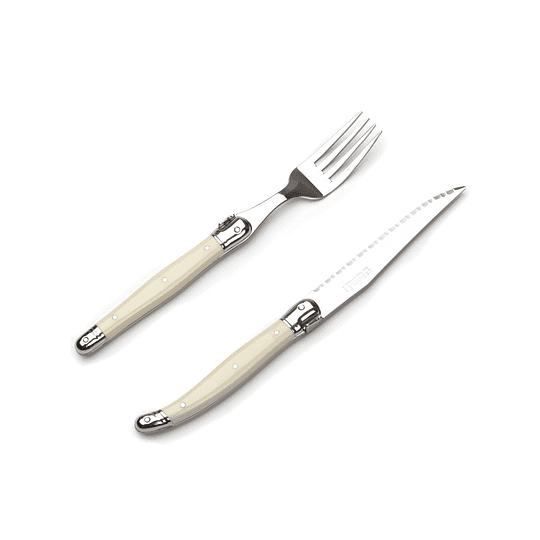 Ideales para compartir en familia un delicioso asado, el juego de cubiertos 12 piezas Laguiole by Andre Verdier es uno de los más bonitos del mundo, son como ningún otro, increíblemente hermosos, agradable de usar y exquisitamente elaborados a mano, cuenta con 12 hermosas piezas Laguiole by Andre Verdier: 6 cuchillos steck y 6 tenedores. Cada pieza representa el pináculo de la mano de obra que distingue a los cubiertos Laguiole de todos los demás. Cada pieza está elaborada con maestría en acero inoxidable y terminada suntuosamente con refuerzos de acero inoxidable, mangos de cinco remaches en resina de alta resistencia color ivory y la tradicional abeja Laguiole. La construcción de espiga completa garantiza un equilibrio de experto y una durabilidad superior. Los cuchillos serrados, de punta afilada, cortan la carne y las verduras fácilmente. El acero inoxidable es de alta calidad con un fantástico acabado de espejo. Son aptos para lavavajillas e igual se recomienda lavar a mano para prolongar la vida útil de los cubiertos. Elaborados 100% en Francia.
